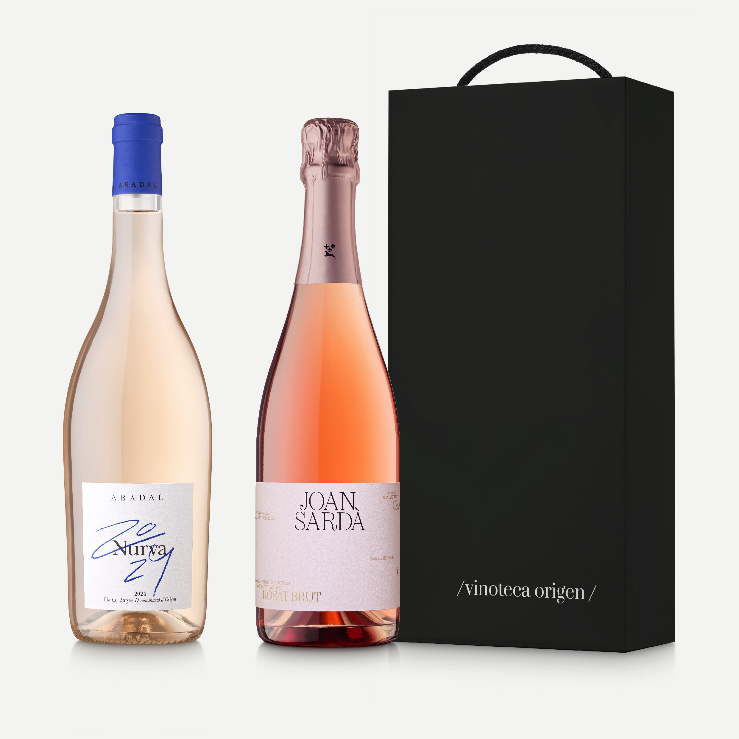 Una botella del vino Abadal Nurva y del cava Joan Sardà Rosat Brut, presentados en un elegante estuche de cartón de dos botellas, con logotipo personalizado "vinoteca origen".